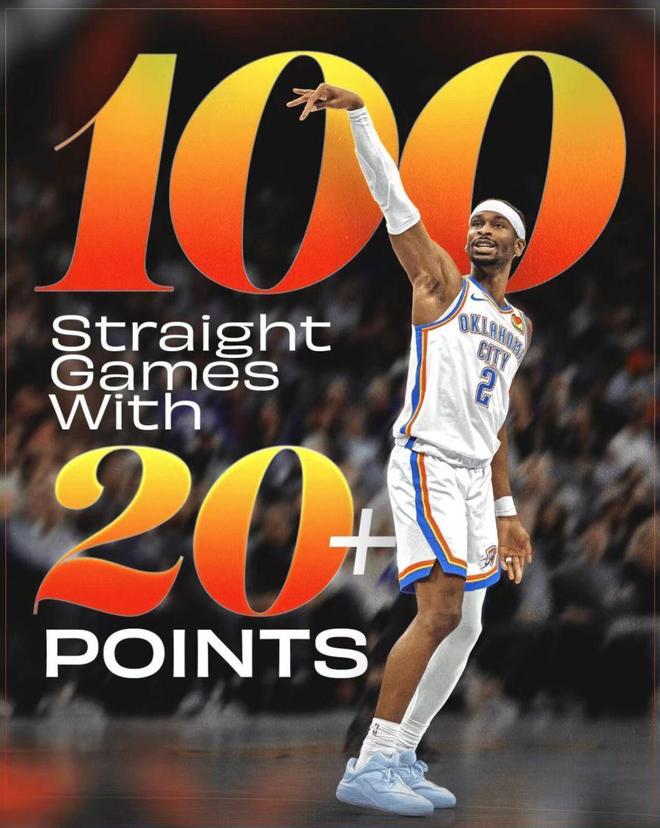 亞歷山大創(chuàng)造連續(xù)100場(chǎng)比賽得分20+里程碑紀(jì)錄,成為NBA歷史第二人,僅次于張伯倫連續(xù)126場(chǎng)得分20+紀(jì)錄。