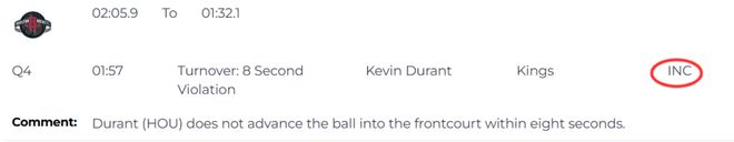 第一次是漏判,發(fā)生在距離第四節(jié)結(jié)束還有1分57秒,裁判報告指出,火箭的杜蘭特未在8秒內(nèi)將球推進前場。這是一次漏吹的8秒違例,火箭獲利,國王吃虧。