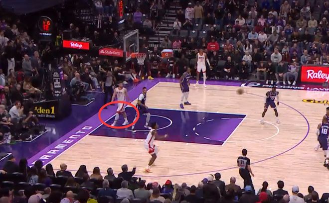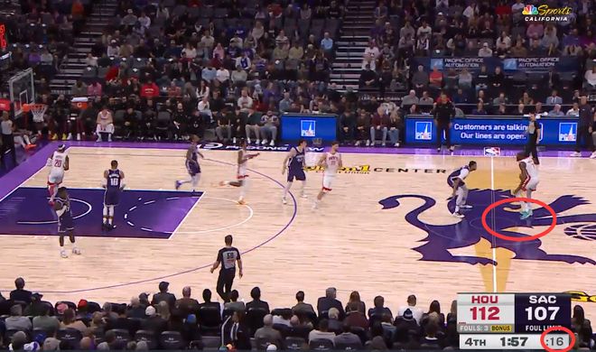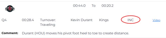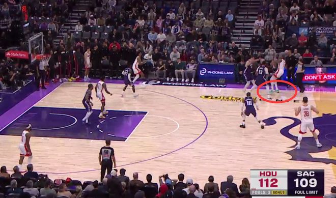 第三次也是漏判,發(fā)生在距離第四節(jié)結(jié)束還有28.4秒,杜蘭特在創(chuàng)造空間時移動中樞腳,這是一次漏吹的走步違例,火箭獲利,國王吃虧。