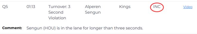 第四次同樣是漏判,發(fā)生在距離加時賽結(jié)束還有1分13秒。申京在對方禁區(qū)內(nèi)停留時間超過3秒,這是一次漏吹的三秒違例?;鸺@利,國王吃虧。