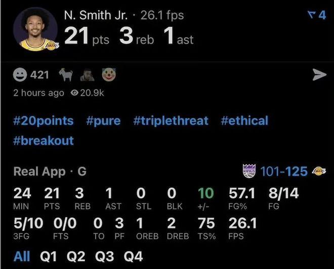 全場14中8,高效得到21分3籃板絲滑銜接