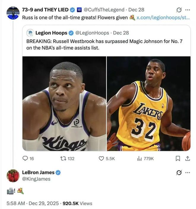 賽前老詹還轉(zhuǎn)發(fā)“威少是歷史最佳之一”
