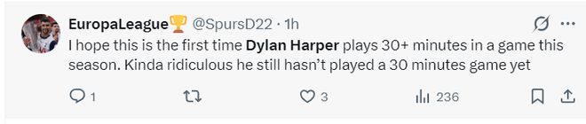 美球迷:我太希望哈珀這場比賽能登場超過30分鐘,令人驚訝的是作為榜眼他本賽季竟然一場30分鐘以上的比賽都沒有。