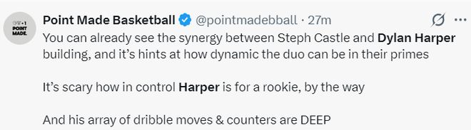 美媒PMB:卡斯?fàn)柵c哈珀已經(jīng)有化學(xué)反應(yīng),這暗示這對組合在巔峰期會多么出色,哈珀作為新秀能輕松掌控局面,這真令人驚嘆,他的運球技巧、防守反擊技巧都非常好。