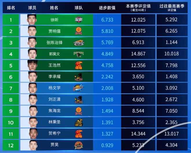 根據(jù)CBA公司公布的最新消息,廣州隊(duì)中鋒徐昕,以進(jìn)步數(shù)值6.733,高居第1-9輪最具進(jìn)步球員第一位。山西隊(duì)后場(chǎng)悍將賈明儒,以進(jìn)步數(shù)值5.81,排在第二位。遼寧隊(duì)中鋒張陳治鋒,以進(jìn)步數(shù)值5.769,排在第三位。同曦隊(duì)后場(chǎng)悍將郭昊文,以進(jìn)步數(shù)值4.849,排在第四位。深圳隊(duì)鋒線悍將王浩然,以進(jìn)步數(shù)值4.758,排在第五位。