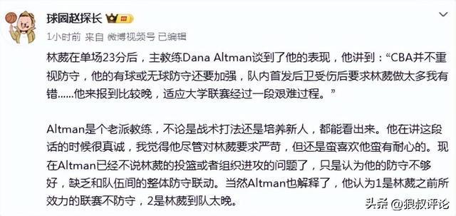 媒體人趙探長(zhǎng)發(fā)文點(diǎn)評(píng):Altman是個(gè)老派教練,不論是戰(zhàn)術(shù)打法還是培養(yǎng)新人,都能看出來(lái)。他在講這段話的時(shí)候很真誠(chéng),我覺(jué)得他盡管對(duì)林葳要求嚴(yán)苛,但還是蠻喜歡他蠻有耐心的?,F(xiàn)在Altman已經(jīng)不說(shuō)林葳的投籃或者組織進(jìn)攻的問(wèn)題了,只是認(rèn)為他的防守不夠好,缺乏和隊(duì)伍間的整體防守聯(lián)動(dòng)。當(dāng)然Altman也解釋了,他認(rèn)為1是林葳之前所效力的聯(lián)賽不防守,2是林葳到隊(duì)太晚。
