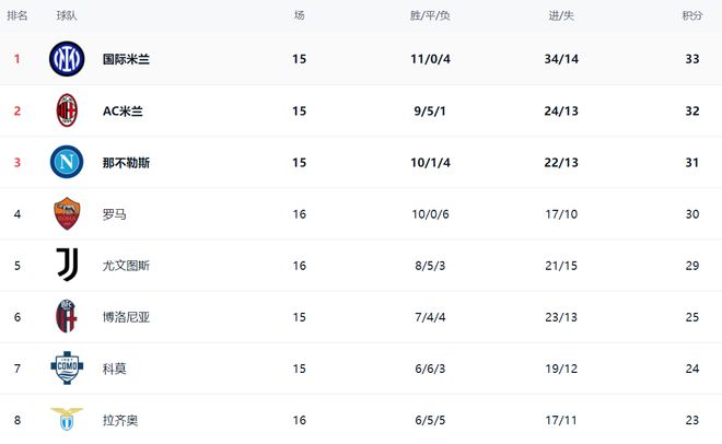 在積分榜上,國際米蘭排名榜首。國際米蘭11勝4負,拿到33分。排名第2的是AC米蘭。AC米蘭9勝5平1負,拿到32分,只比國際米蘭少1分。第3名的是那不勒斯,拿到31分。輸球的羅馬依然是30分,排名第4。尤文圖斯贏球之后,總積分達到29分,排名第5,只比羅馬少1分,下一輪有可能殺入歐冠區(qū)。博洛尼亞以25分排名第6。法布雷加斯率領(lǐng)的科莫以24分排名第7。拉齊奧23分排名第8。