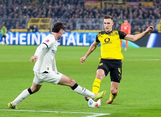 比賽只踢了10分鐘,多特蒙德就進(jìn)球了!聚勒在右側(cè)起球傳中,皮球飛到后點。布蘭特凌空射門,皮球彈地后鉆入球門!多特蒙德獲得夢幻般的開局。第30分鐘,阿德耶米有擴(kuò)大比分的機(jī)會,只可惜他的近距離射門被門將撲了出去。第42分鐘,雷納在禁區(qū)外起腳遠(yuǎn)射,皮球被擋了一下發(fā)生折射,偏出了球門。半場結(jié)束,多特蒙德1-0領(lǐng)先門興格拉德巴赫。