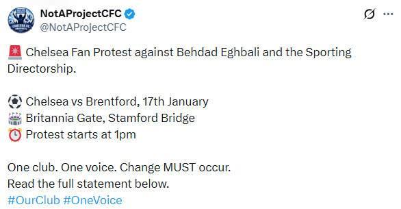 “Not a Project CFC”是一個切爾西球迷組織,他們正在策劃即將到來的示威活動,該活動定于1月17日切爾西對陣布倫特福德的比賽前在球場舉行。
